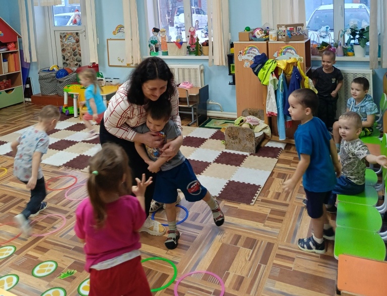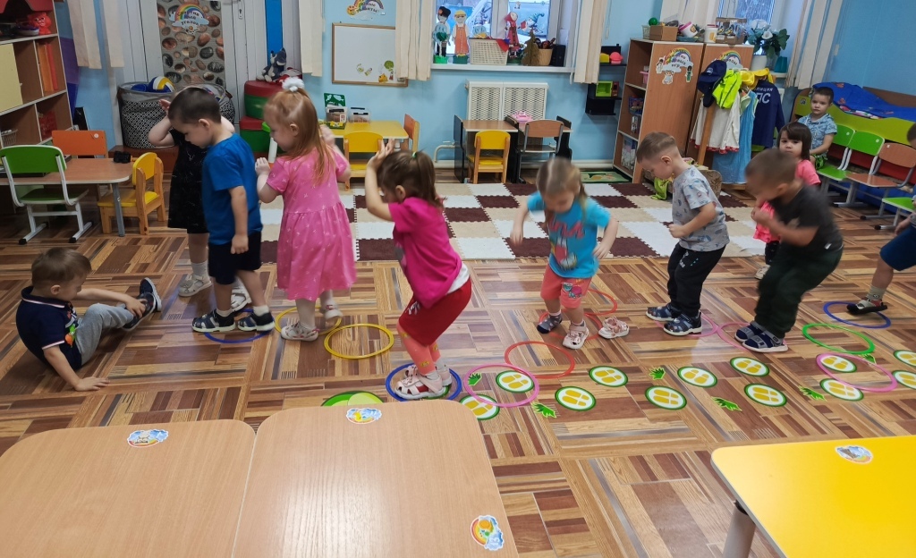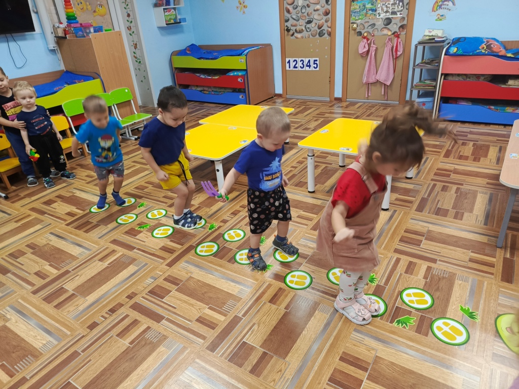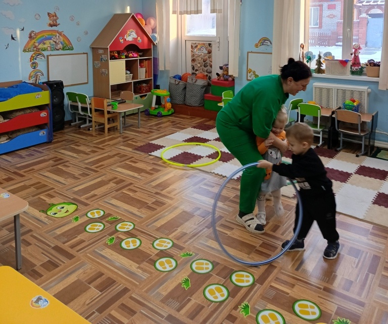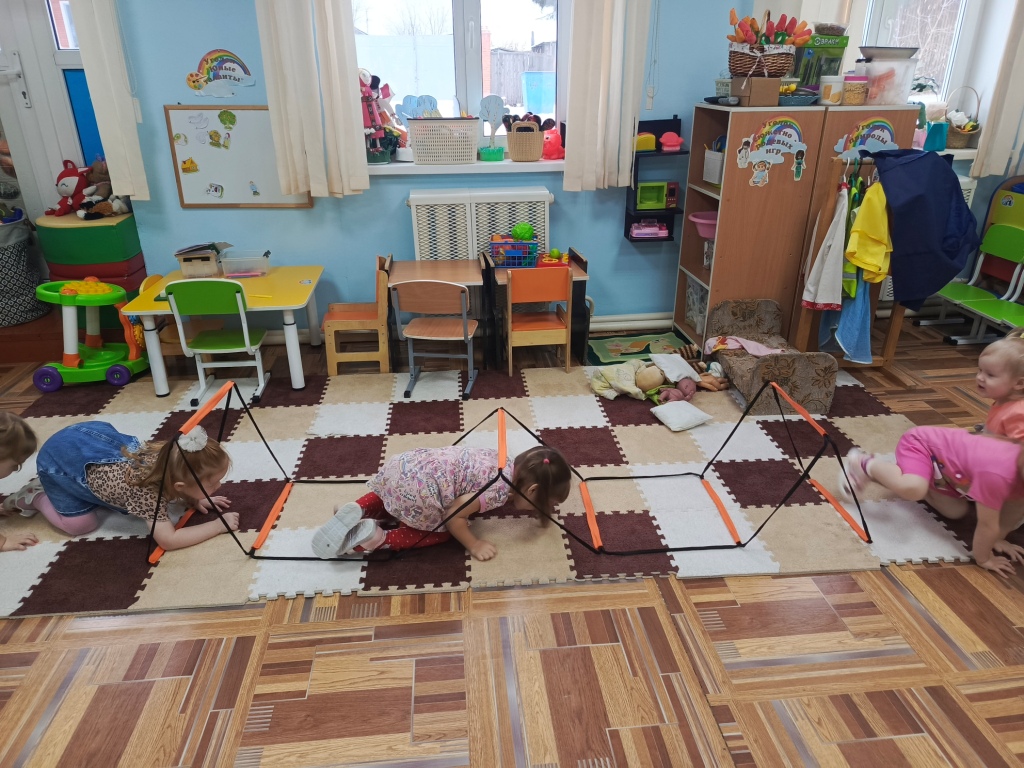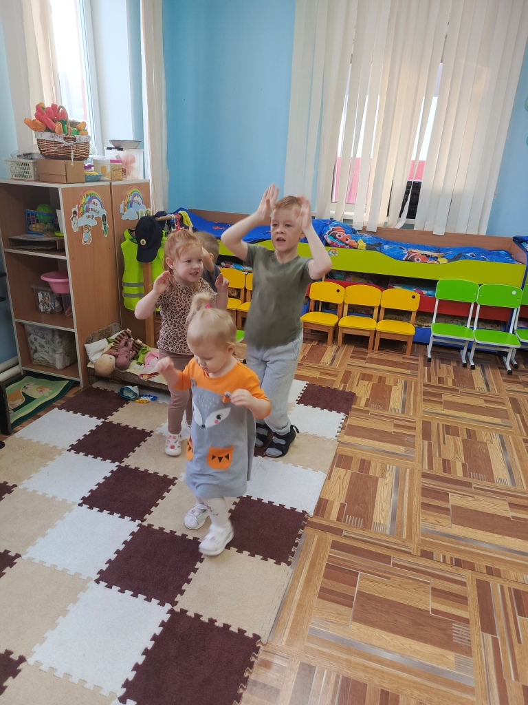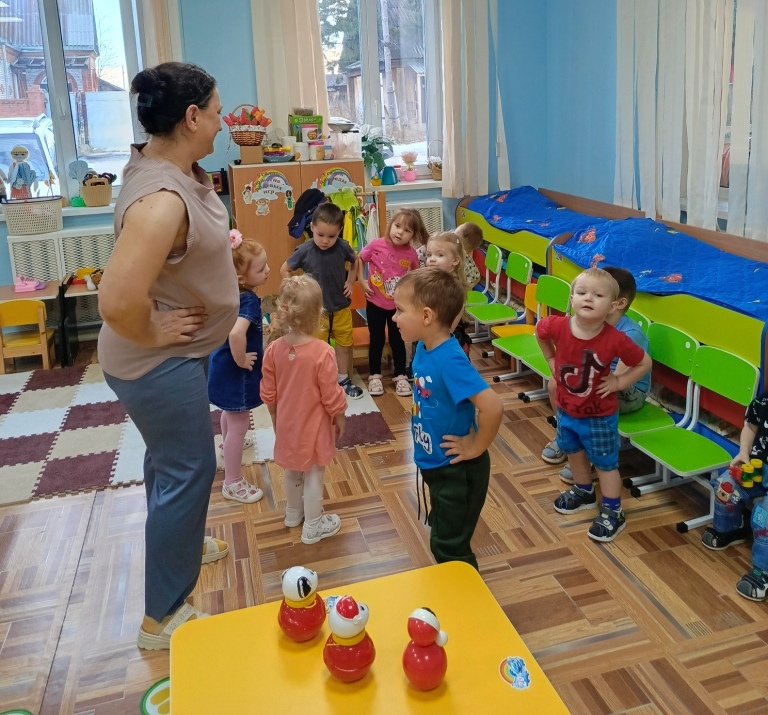 В младшей разновозрастной группе проведены занятия по физической культуре. С ребятами разучили утреннюю зарядку "Неваляшки" - формировали умения слушать педагога и выполнять показанные движения. Также формировали умения строится друг за другом, прыгать друг за другом на двух ногах, поочередно пролазить под лесенкой.